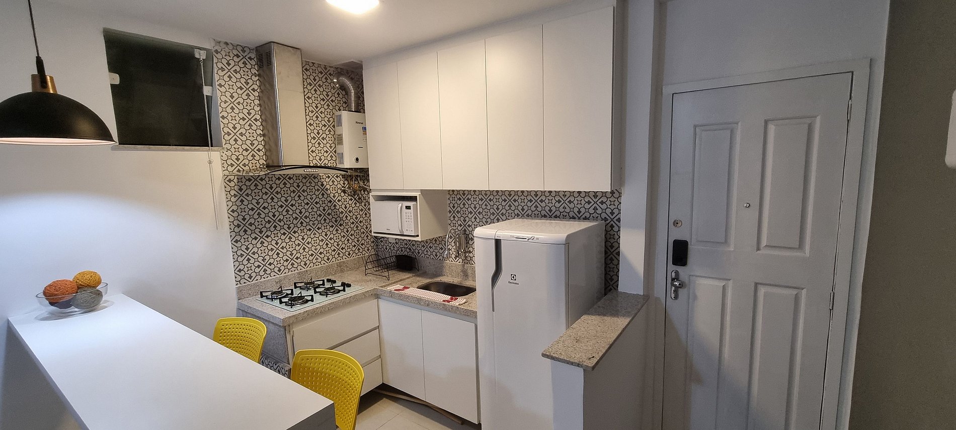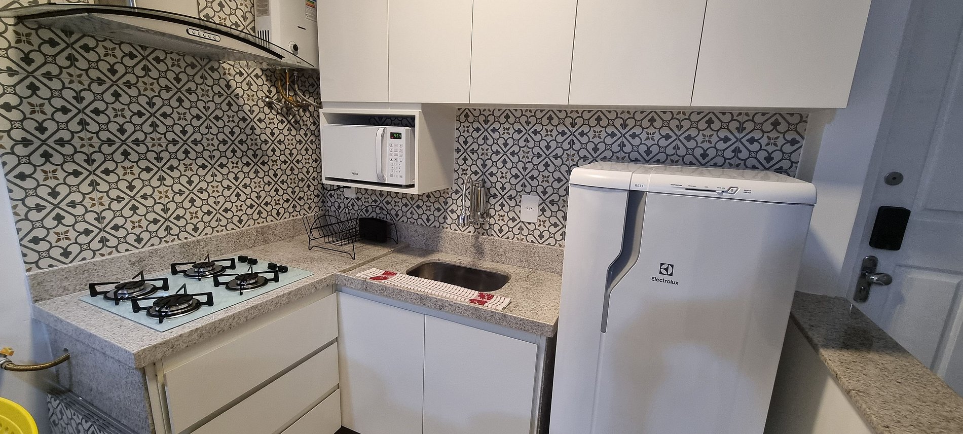 - Cozinha equipada com frigobar, fogão, micro-ondas, cafeteira e utensílios (panelas, pratos, talheres etc).