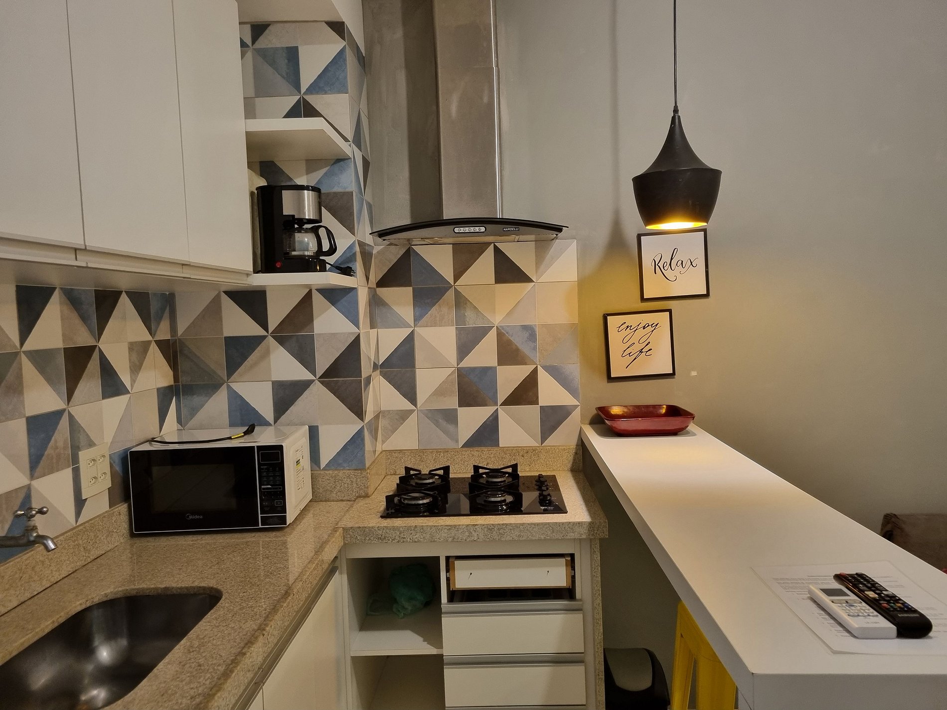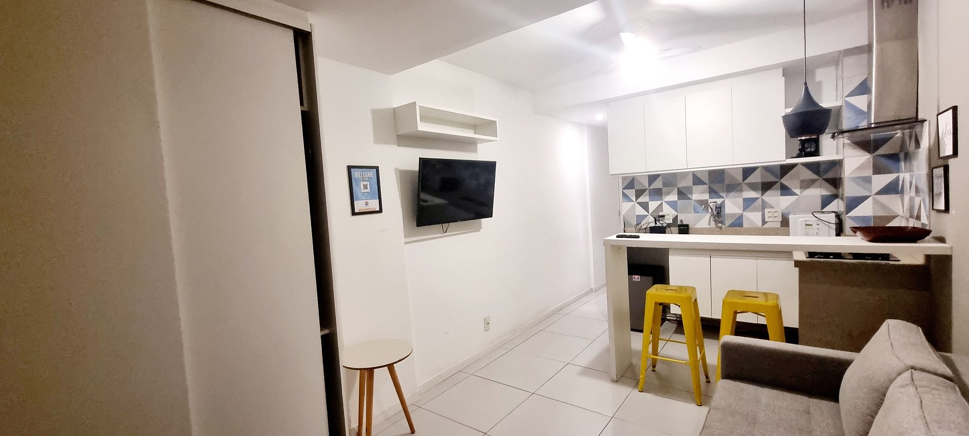 - Cozinha equipada com frigobar, fogão, micro-ondas, cafeteira e utensílios (panelas, pratos, talheres etc).