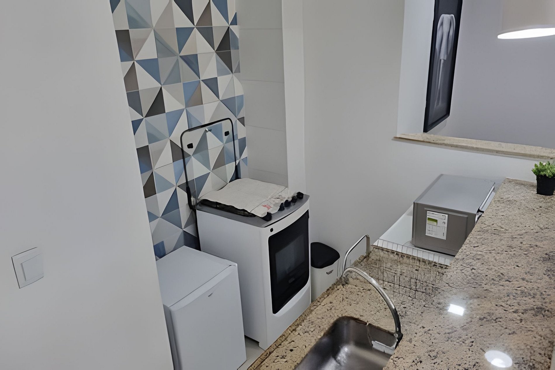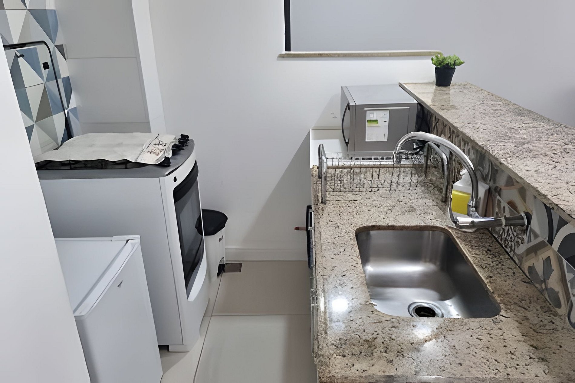 - Cozinha equipada com frigobar, fogão, micro-ondas, cafeteira e utensílios (panelas, pratos, talheres etc).