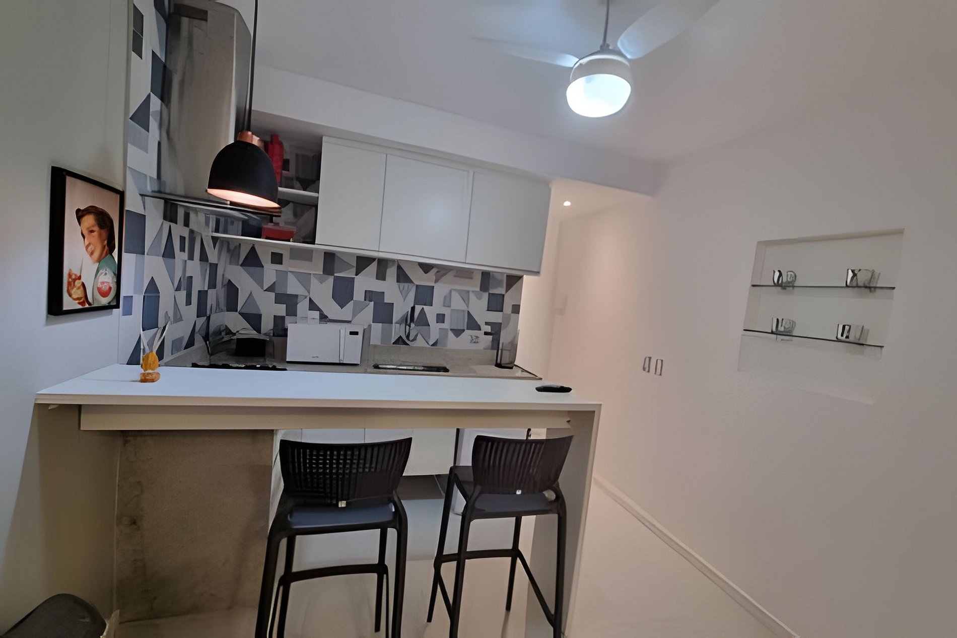 - Cozinha equipada com frigobar, fogão, micro-ondas, cafeteira e utensílios (panelas, pratos, talheres etc).